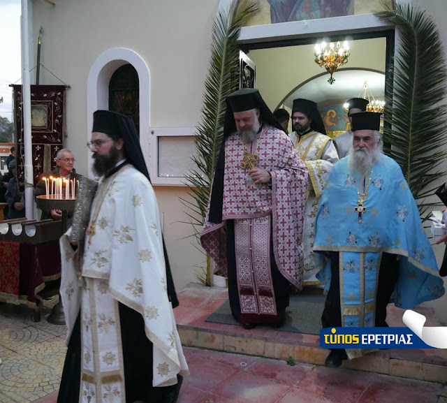 Μετά τον Εσπερινό, ακολούθησε η λιτανεία της Ιερής Εικόνας, την οποία πλαισίωσαν τα «Αγγελάκια», κορίτσια από το Κατηχητικό και Σχολεία της Ερέτριας, ντυμένα στα λευκά με αναμμένες λαμπάδες και άνθη, υπό την καθοδήγηση της Θεολόγου και κατηχήτριας Μαλαματένιας Κιάκη.